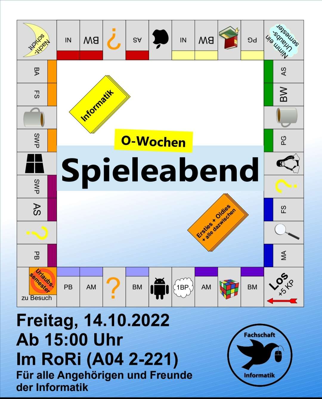 Moin Moin! Am 14.10. ab 15:00 Uhr findet endlich wieder ein Spieleabend im RoRi statt! Alle interessierten sind herzlich eingeladen, sich dann im RoRi, also Raum A04 2-221 zu versammeln und gemeinsam Gesellschaftsspiele zu spielen. Diese dürfen selbstverständlich gerne selber mitgebracht werden, aber auch wir werden dafür sorgen, dass ausreichend Spiele vorhanden sind. Auch für Getränke und Snacks wird gesorgt, die für einen kleinen Unkostenbeitrag bei uns erworben werden können.
